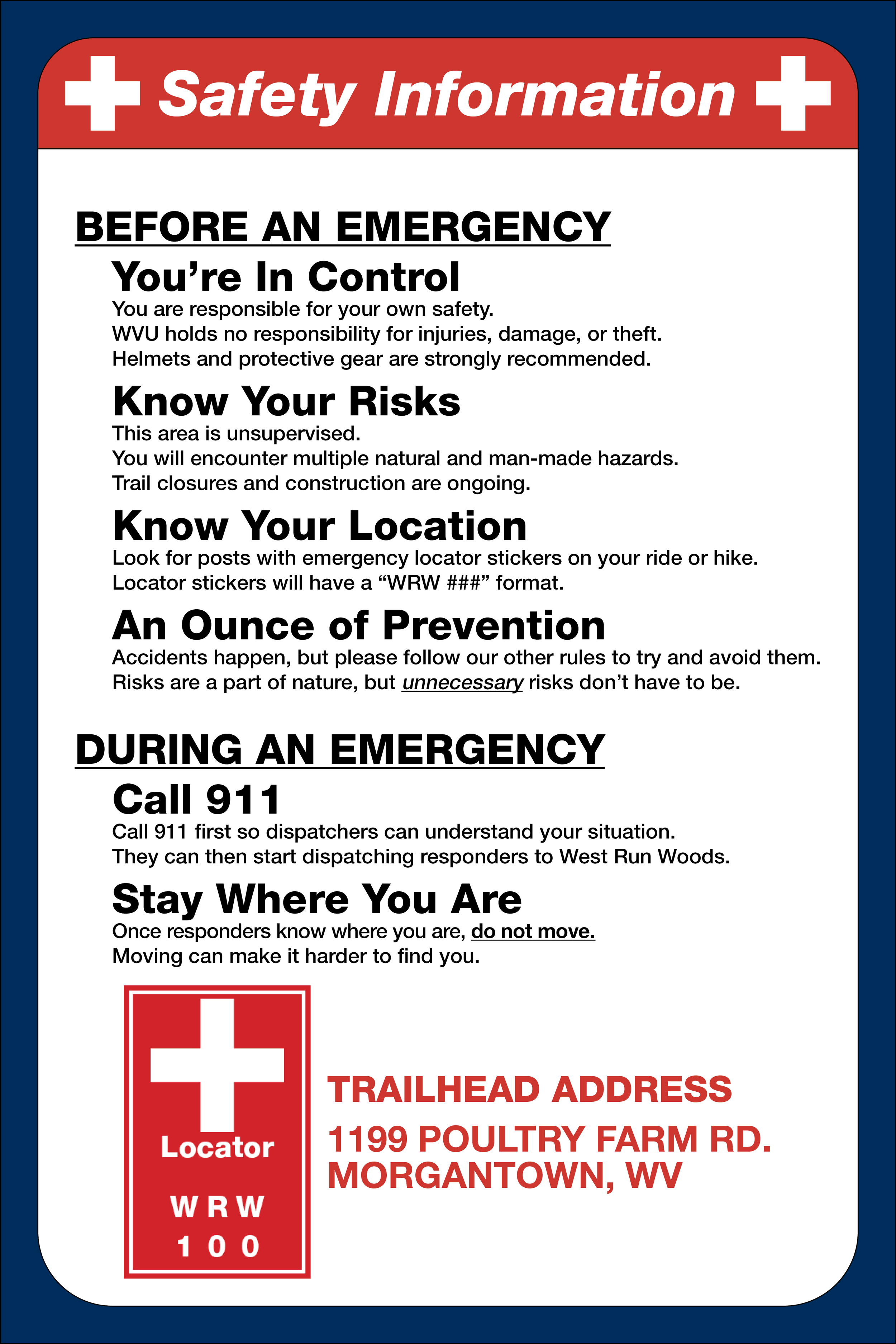While funded by the WVU Smith OEDC as a Graduate Research Assistant, I was responsible for updating existing trail signage and designing new welcome, hub, and on-trail signage. The purpose of the signs was primarily informational so that trail users could navigate through the newly constructed multi-user and mountain bike trails. Designs were differentiated based on the location and purpose of the content which ranged from primary access trailheads and trail hubs to flexible fiberglass post decals and temporary trail closure signs.