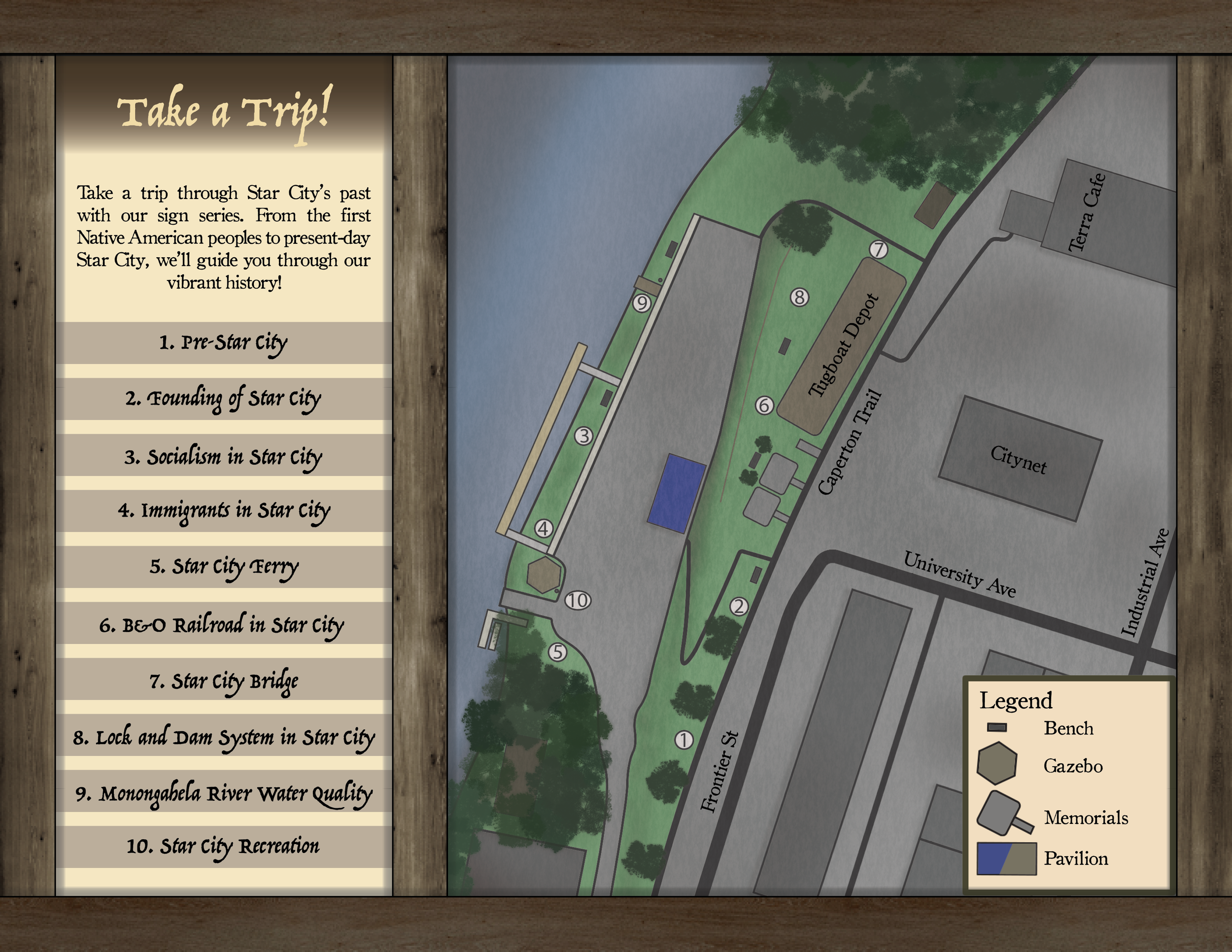 After completing my undergraduate degree, I was approached with an opportunity to serve as the lead designer of this historical sign project. Through funding provided by a WV Humanities Council grant, I worked alongside historians, community leaders, WVU faculty, and professional printers from conceptual designs to the installation and publicized unveiling of the sign series on the Star City waterfront.